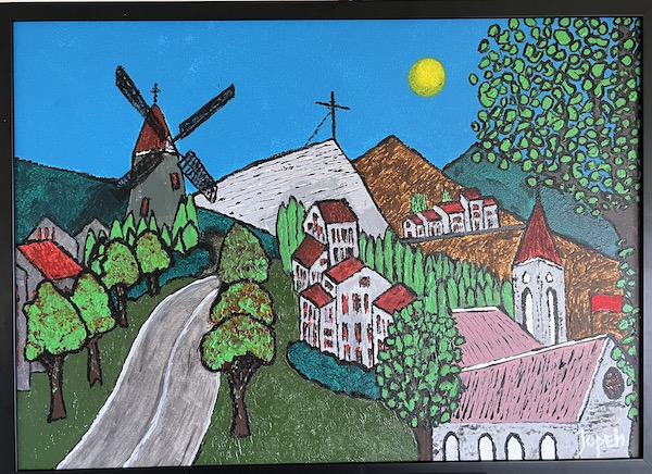 French windmill in the Vosges, the mountain range between France and SwitzerlandPainted in acrylic in New Zealand, August 2022.